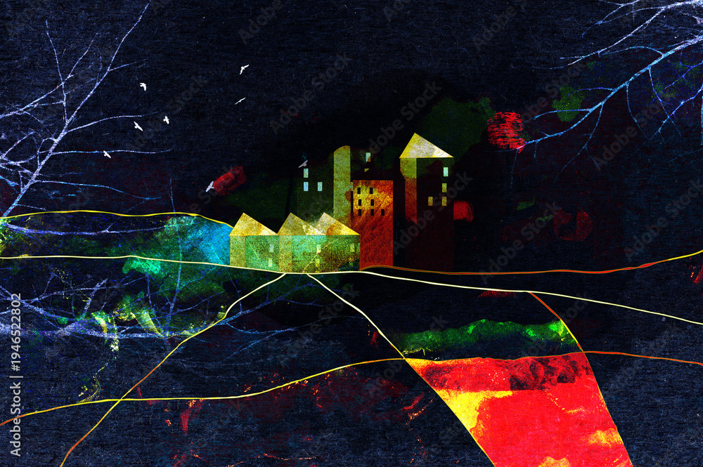 Dla Dzieci - Ilustracja grafika ciemna noc osiedle domów rozświetlone dróżki abstrakcja. #1946522802