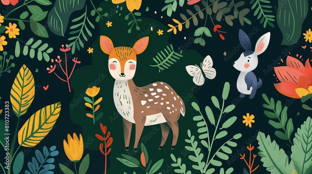 Dla Dzieci - Obraz przedstawia leśną scenę z jeleniem i królikiem. Jelen i królik są przedstawieni w... #810723383
