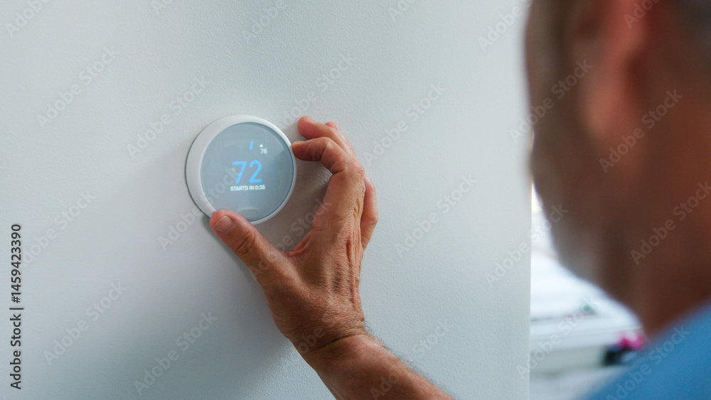 • Senior Hispanic Man Adjusting Digital Central Heating Thermostat In Home