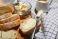 • Wooden board with sliced bread, butter and jug of cream on grey grunge background