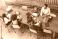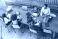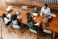 • A group of three workers are talking while two female workers are looking at a laptop while sitting at a desk next to them