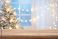 • Wooden table top for product display in front of blur Christmas tree and decorated window interior background