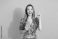 • Young stylish woman with floral top and phone posing against bright yellow background