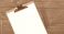 • Flat lay of wooden table clipboard featuring blank paper and blue pen wide copy space for text