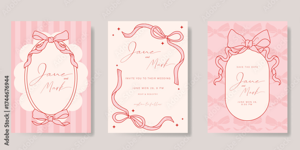 • Wedding invitation card background vector set. Minimal hand drawn ribbon frame and pattern. Design for wedding, vip cover template, rsvp modern card, poster.