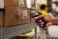 • Close up of black worker scanning the barcode awb tags on cargo boxes, registering the merchandise and shipment details before distribution. Using scanner on tracking numbers in depot.