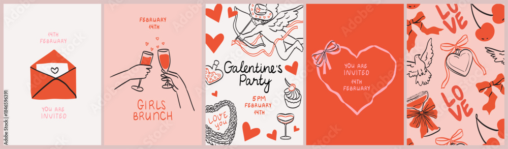 • Happy Valentines or Galentines Day invitation cards in trendy whimsical hand drawn style with cupid, love letter,cherry and hands with wine. Template for ads, branding, banner, cover, label, poster.