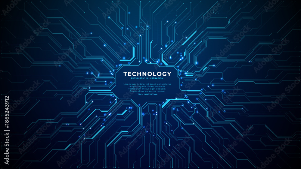 • Blue circuit board design with electronic chip components and data lines creating futuristic tech pattern on dark digital background. Digital technology vector background.