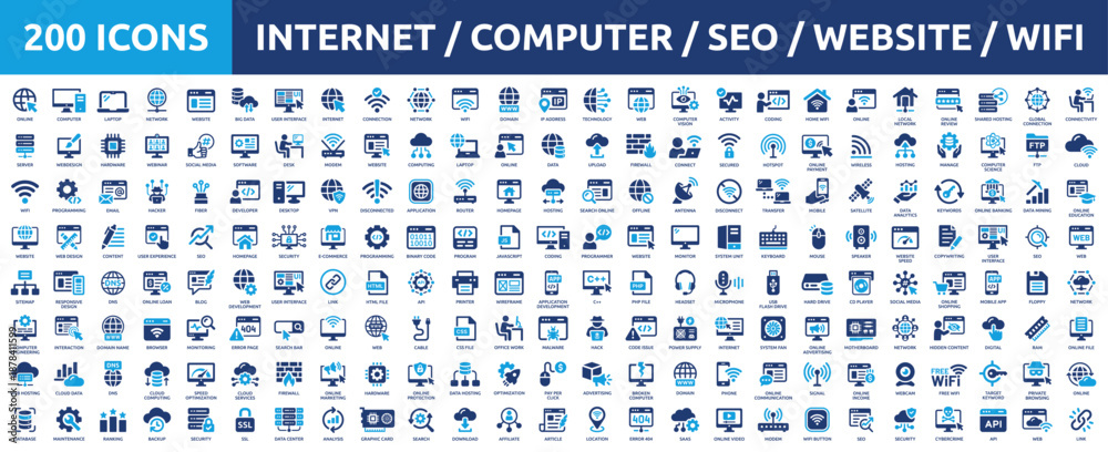 • Huge set of 200 solid icons. Mega collection concept of internet, computer, SEO, website and Wifi. Vector illustration.