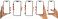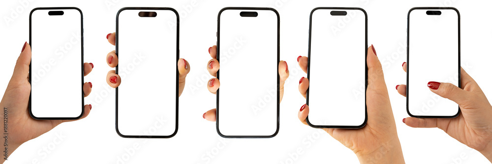 • Set of female hands holding smartphone mockups with blank screens isolated on transparent background.