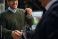 • Close up of man holding new car key while shaking hands with salesperson in a showroom.