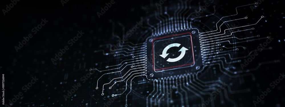 • Software Update Ensuring System Efficiency Illustrated on a Processor Touched by a Human Hand.