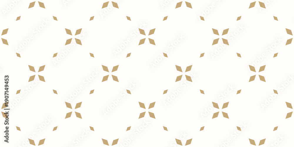 • Luxury golden minimal floral geometric seamless pattern. Simple vector abstract background with flowers, leaves, diamonds, grid. Gold minimalist royal texture. Elegant repeated design for decor, print