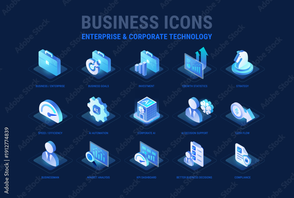• Technology icons set for Business and Enterprise workflow diagram - Corporate AI, AI automation, Business strategy, growth, kpi, compliance, AI decision support - high quality isometric vector