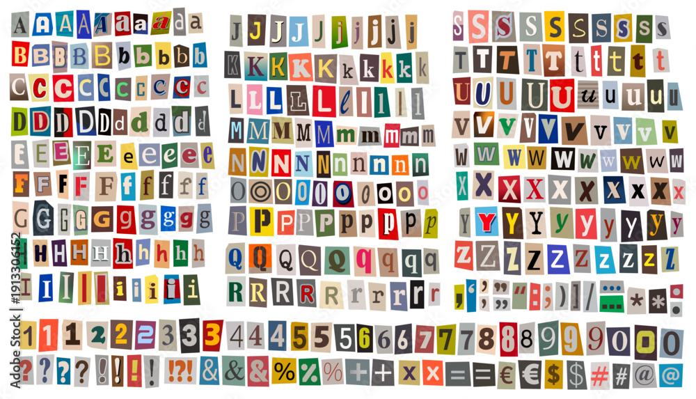 Krajobraz wiejski - Collage of cut-out letters, numbers, and symbols on white. #1913306152