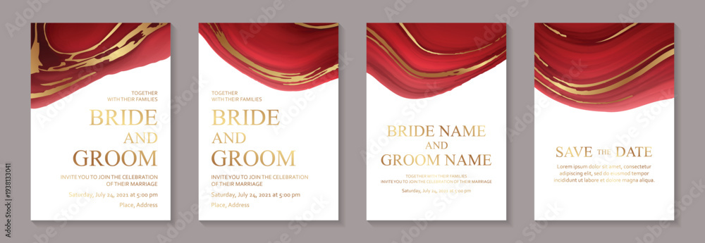 • Luxury red liquid marble backgrounds with golden waves for wedding invitations or greeting cards or business.