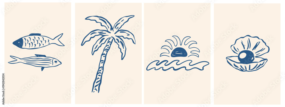 • Italian amalfi sicily doodle beach illustration set. Summer vacation, tropical naive coastal sketch style elements palm tree, sun, seashell. Vector sea travel collection for card, poster, placard