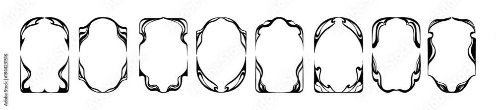 • Antique art deco frame set, hand drawn organic romantic vintage border, doodle wedding invitation. Elegant gothic ornamental decoration classic abstract swirl print. Dark antique arch frame collection