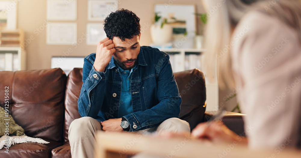 Pejzaż - Clipboard, conversation and therapist with man in office with checklist for mental health... #1912515082