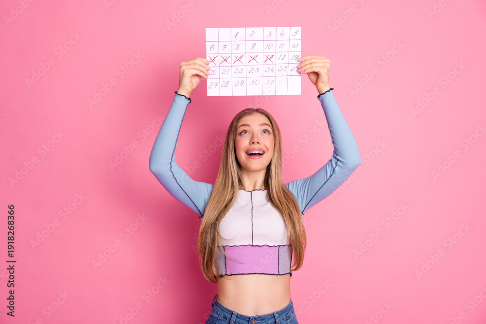 Pejzaż - Happy young woman holding a calendar with marked dates on pink background showcasing cheerful and... #1918268366