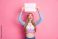 • Happy young woman holding a calendar with marked dates on pink background showcasing cheerful and lively energy
