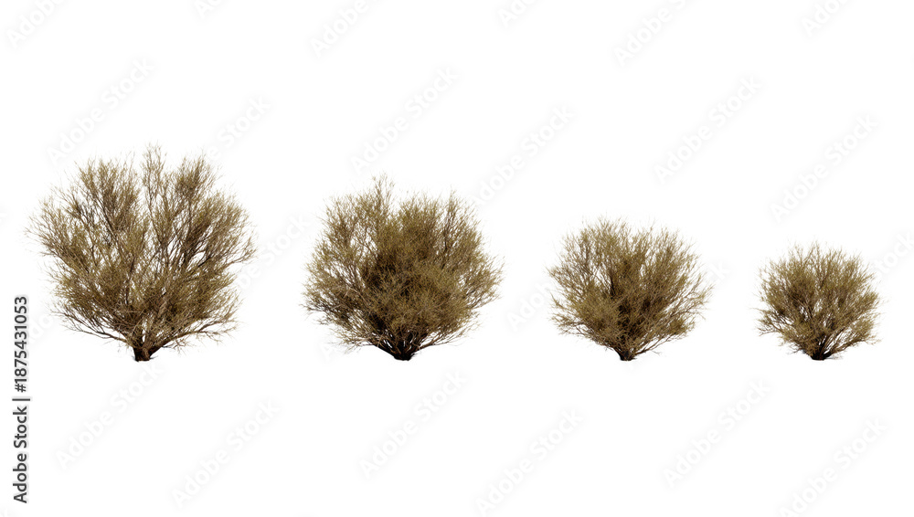 • Collection of four dry brown desert bushes and shrubs in varying sizes, isolated on transparent background