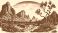 • Mountain desert texas background landscape. Wild west western adventure explore inspirational vibe. Graphic Art. Engraving Vector