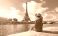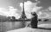 • Young traveler woman in red dress and hat sitting on the quay of Seine River looking at Eiffel Tower, famous landmark and travel destination in Paris.