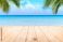 • Wooden floor or plank on sand beach in summer. For product display.Calm Sea and Blue Sky Background.