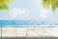 • Top of wood table with seascape and palm leaves, blur bokeh light of calm sea and sky at tropical beach background. Empty ready for your product display montage. summer vacation background concept.