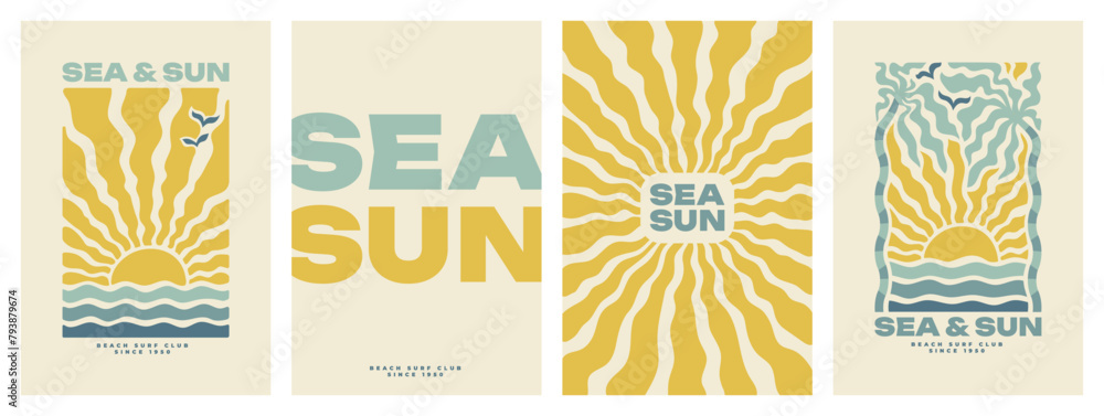 Plaża - Boho groovy palm tree beach sun sea. Surf club vacation and sunny summer day aesthetic. Vector... #793879674
