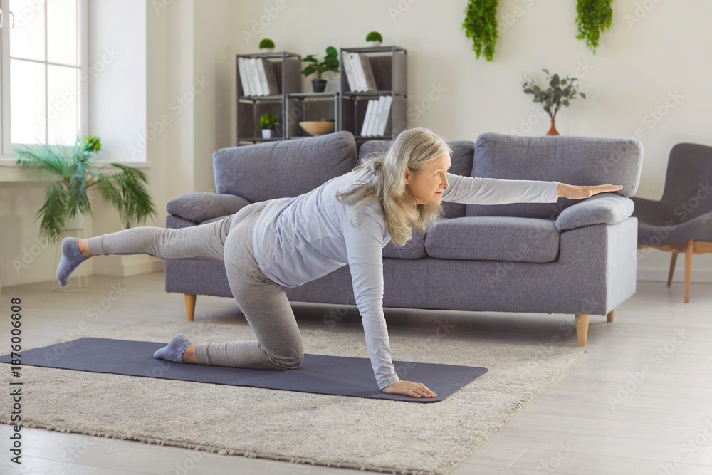 • Senior woman doing balance core training on mat, physical exercises and fitness workout at home. Old active person showing bird dog pose, stretching muscles of legs and arms, core balance and strength