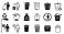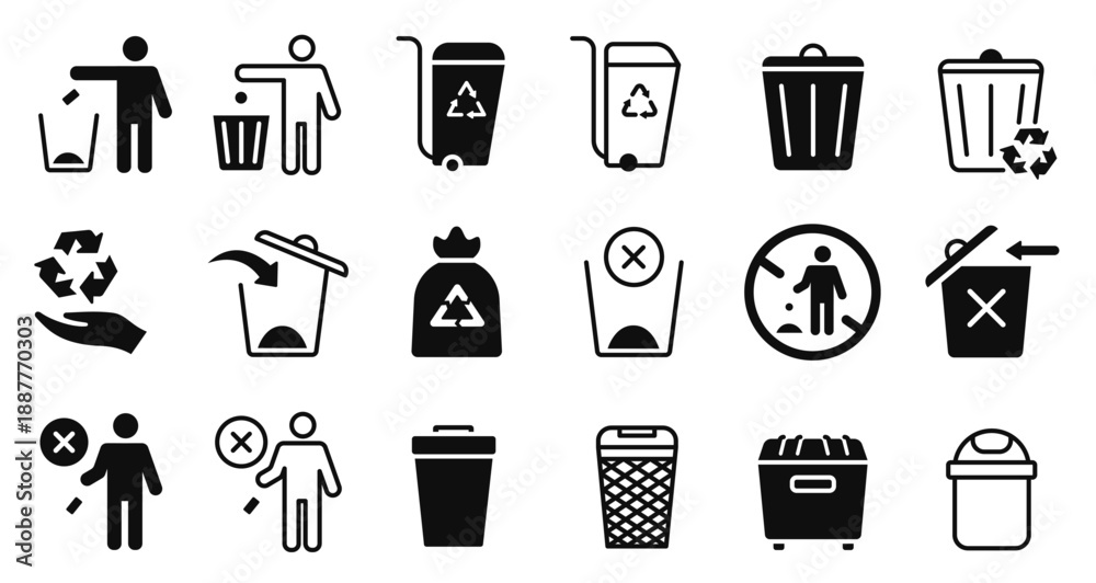 • Trash icons. Waste bin and recycling signs for environmental cleanup, public sanitation and eco friendly garbage disposal or sorting, rubbish bucket symbols. Vector isolated dustbin pictogram set