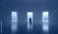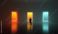 • Clean composition. Man observing three bright doorways in wide minimal hall. Concept of decision-making, product pathways, UX flow design, marketing metaphors, self-growth and choice themes.