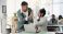 • Celebration, high five and laptop with designer people in office together for bonus or motivation. Computer, design and success with happy employee team at desk in workplace for goals or target