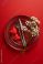 • Elegant Saint Valentine vertical scene with crimson plates, silverware, two heart candles, and sprigs of baby's breath on a bold red background