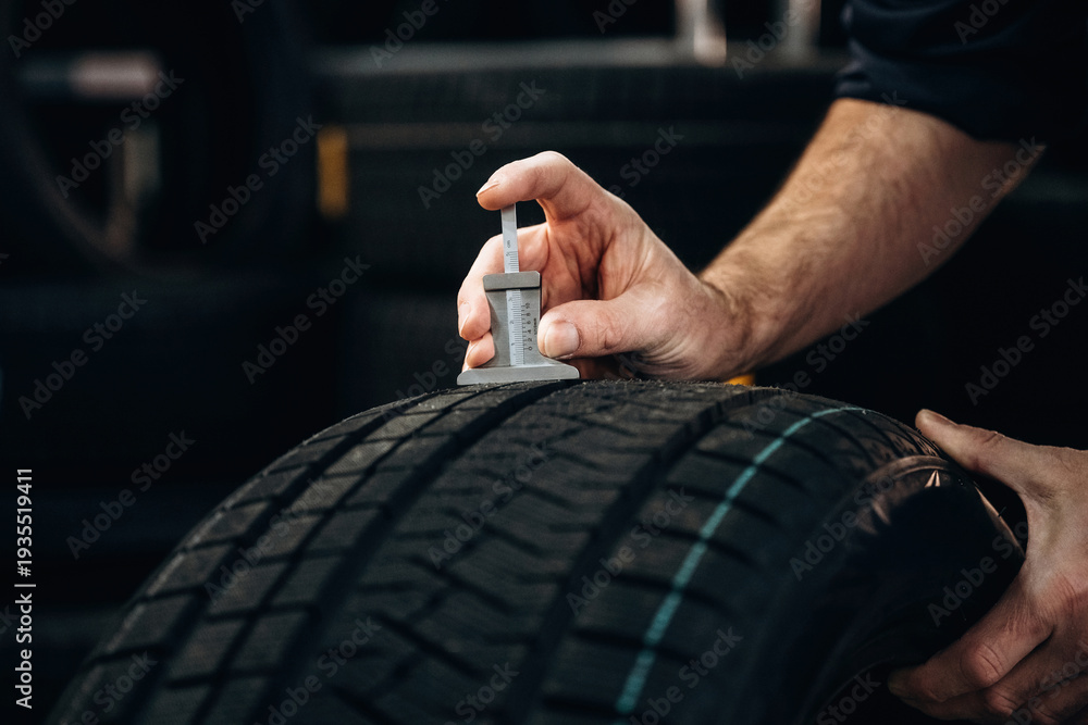 Rafa koralowa - Hand of a technician measuring tire tread depth with a gauge on a black tire in a workshop... #1935519411