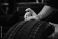 • Hand of a technician measuring tire tread depth with a gauge on a black tire in a workshop surrounded by additional tires in the background