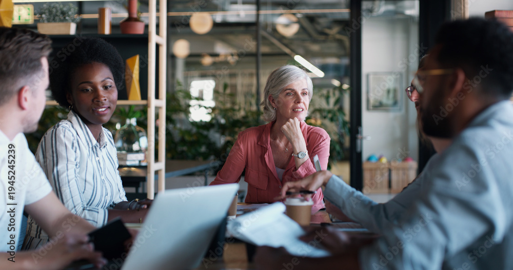 Rafa koralowa - Business, team or woman with discussion in meeting for topic revision, writing advice or... #1945245239