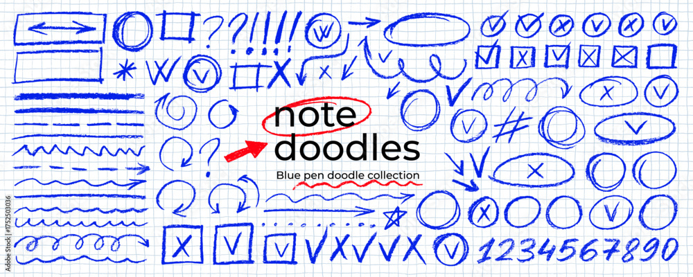 • Hand drawn blue highlights, underlines and emphasis crayon elements. Blue pen check marks, ovals and school notebook vector shapes for hand drawn notes. Checkered paper sheet.