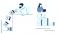 • Man tipping risk blocks over edge contrasts with woman on bar graph using a laptop. Ideal for risk management, business growth, strategy, decision-making, leadership, innovation, change. Simple flat