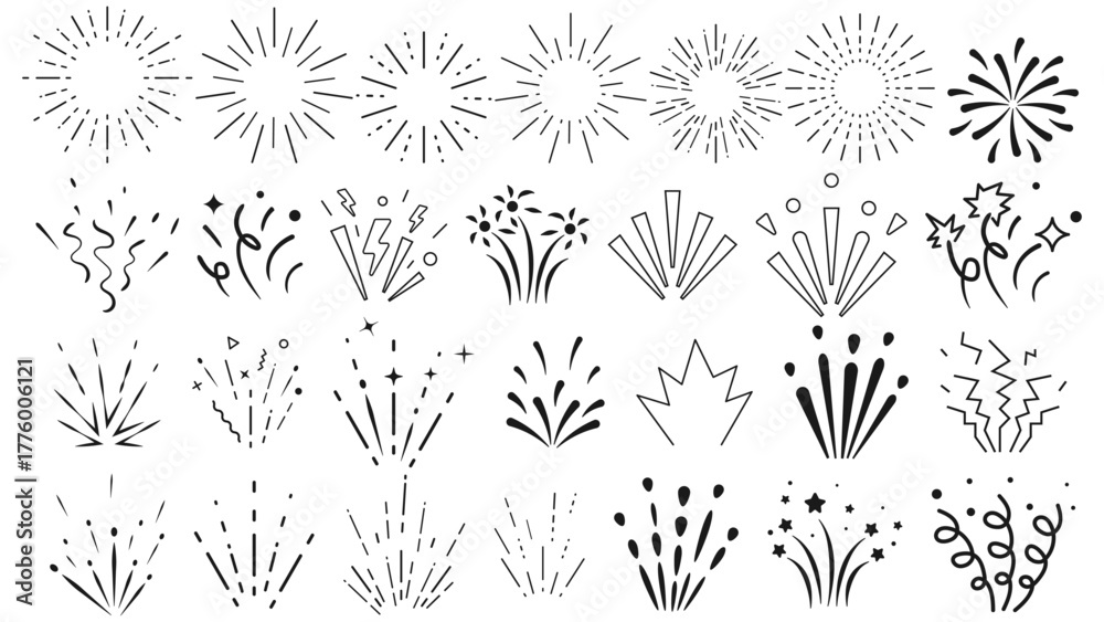 • Set of vector line icons representing fireworks, confetti, and celebration bursts in modern minimal style. Minimal decorative vector shapes of confetti, fireworks, and star bursts for graphic.