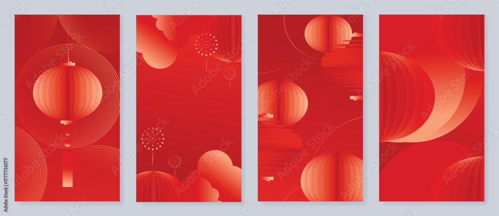 Niebo - Red Chinese New Year 2026 poster vector set with golden lanterns, firework sparkles and geometric... #1777736077
