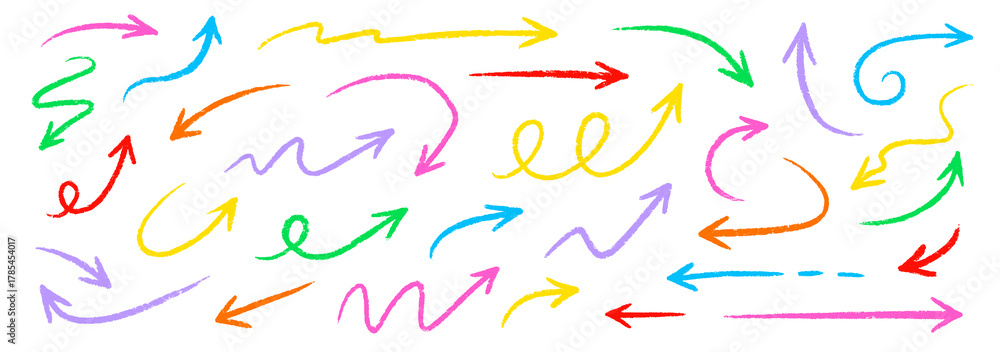 • Arrow crayon pastel pencil chalk color line stroke. Sketch chalk pastel color pencil texture line kid fun arrow icon. Hand drawn grunge crayon pencil brush direction elements. Vector illustration