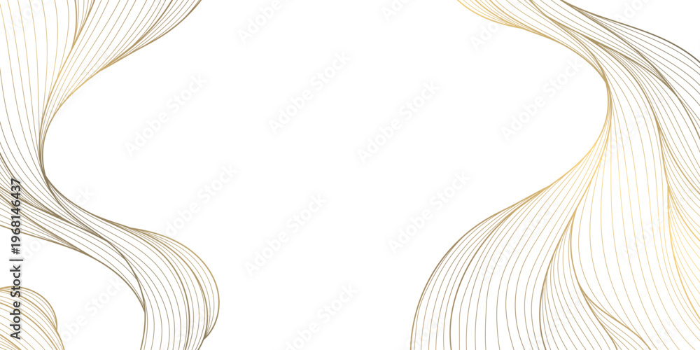 • Luxury abstract gold wave pattern, elegant line art on white background. Japanese and Chinese vector design, smooth curves, flowing silk texture, premium frames, wallpapers, fabric prints.