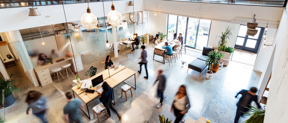 • Wide angle view of people working and walking inside a modern coworking space with open layout, natural light, motion blur and dynamic professional atmosphere.