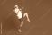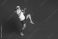 • Playful Santa look alike dances in bright red studio wearing white tank top plaid shorts and striped socks for festive christmas vibe