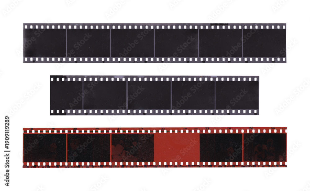 • Blank Film Strip Frames Set with Negative and Red Slide Isolated. Set of three vintage film strips with empty frames, including dark negatives and a red-tinted strip. Photo high resolution