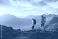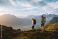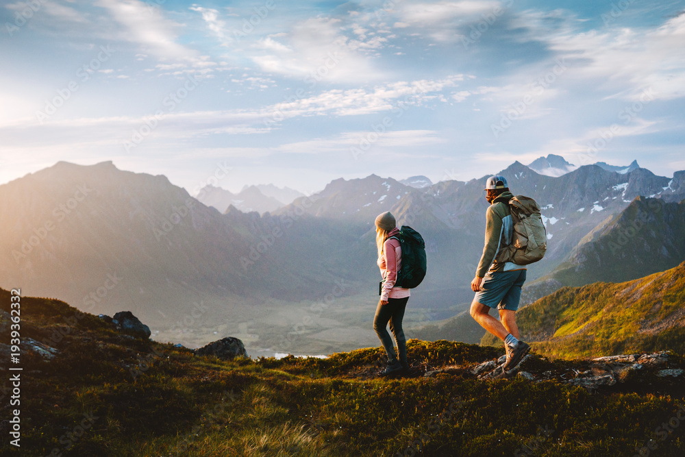 • Couple hiking in Norway man and woman travel together in Lofoten islands, friends on active summer vacation healthy lifestyle family trekking outdoor adventure backpacking trip eco tourism