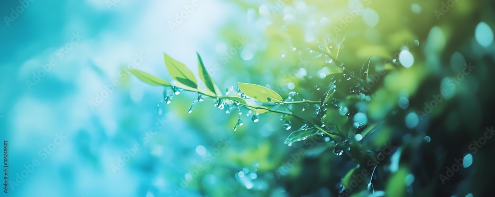 • Branche verte avec gouttes de rosée sur fond turquoise bokeh.